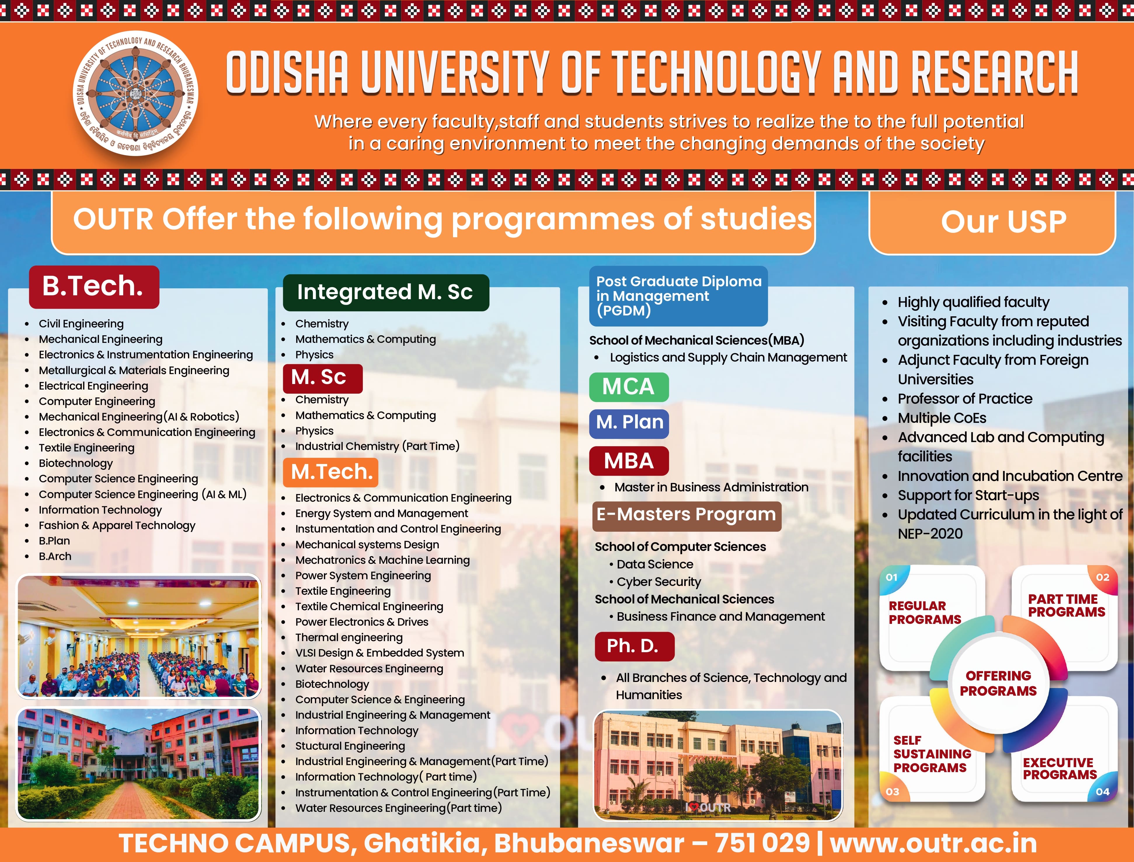 B. Tech., B. Arch., M.Tech. M.Arch., MCA, M. Sc. and Integrated M.Sc. admission to different UG, PG and Ph.D. programmes are made through various Entrance Examinations conducted at State , National and Institutional level each year. The details of the eligibility, reservation, medical requirements, procedure for admission etc. are available in Odisha JEE "https://odishajee.com".